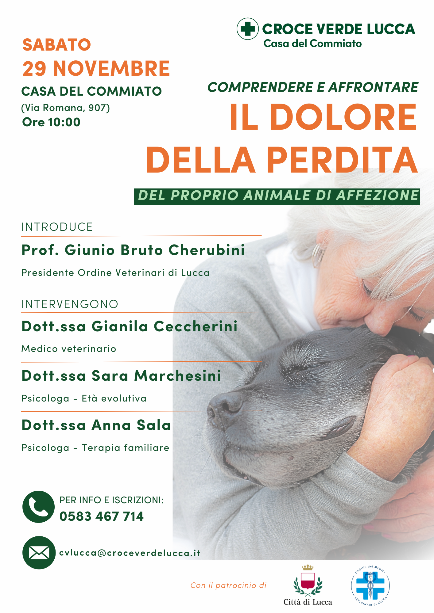 Due italiani su tre possiedono un animale domestico e lo considerano un membro della propria famiglia. Quando viene a mancare si prova pertanto un lutto reale, vivo, sebbene molto spesso sottovalutato. Per tali ragioni, la Croce Verde di Lucca ha organizzato l’incontro Comprendere e affrontare il dolore della perdita del proprio animale da affezione, patrocinato da Comune di Lucca e Ordine dei Medici veterinari di Lucca, previsto per sabato 29 novembre, alle ore 10:00, presso la Casa del Commiato di Lucca (via Romana, 907), gratuito e aperto a tutta la cittadinanza.