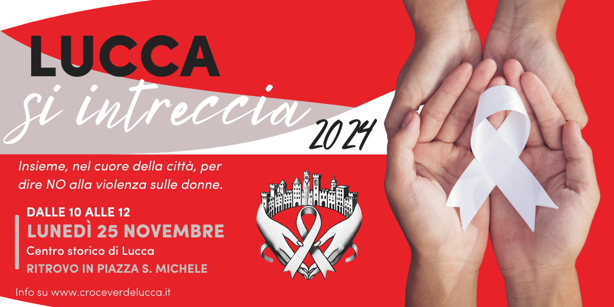 Lunedì 25 novembre, in occasione della Giornata internazionale per l’eliminazione della violenza contro le donne, si terrà Lucca si intreccia 2024, terza edizione della manifestazione organizzata da Croce Verde Lucca, Auser Filo d’Argento Lucca e Centro Antiviolenza Luna. Il progetto che le tre associazioni portano avanti dal 2022 prevede il coinvolgimento delle scuole di ogni ordine e grado, di tutta la cittadinanza, di Enti e Associazioni del Territorio.